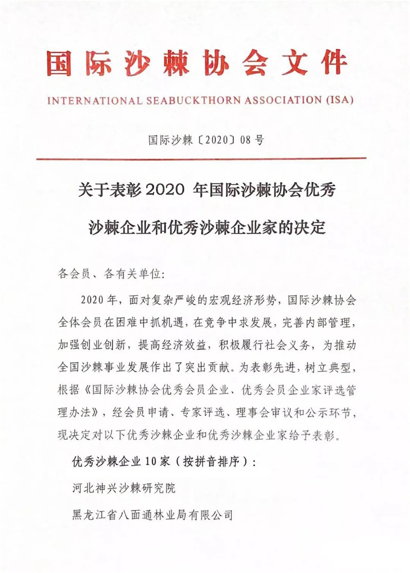 10月13日,2020年国际沙棘协会(中国)企业委员会年会暨全国沙棘学术交流会在山西省吕梁市召开。国际沙棘协会/水利部沙棘开发管理中心秘书长卢顺光、国际沙棘协会技术委员会/水利部沙棘开发管理中心委员胡建忠、国家林业和草原局沙棘工程技术研究中心主任郭学斌、吕梁市副市长尉文龙等政府领导,以及西北师范大学生命科学学院廉永善教授等学术专家出席。我公司董事长毕书杰受邀出席了本次会议。内蒙古沙棘种植加工